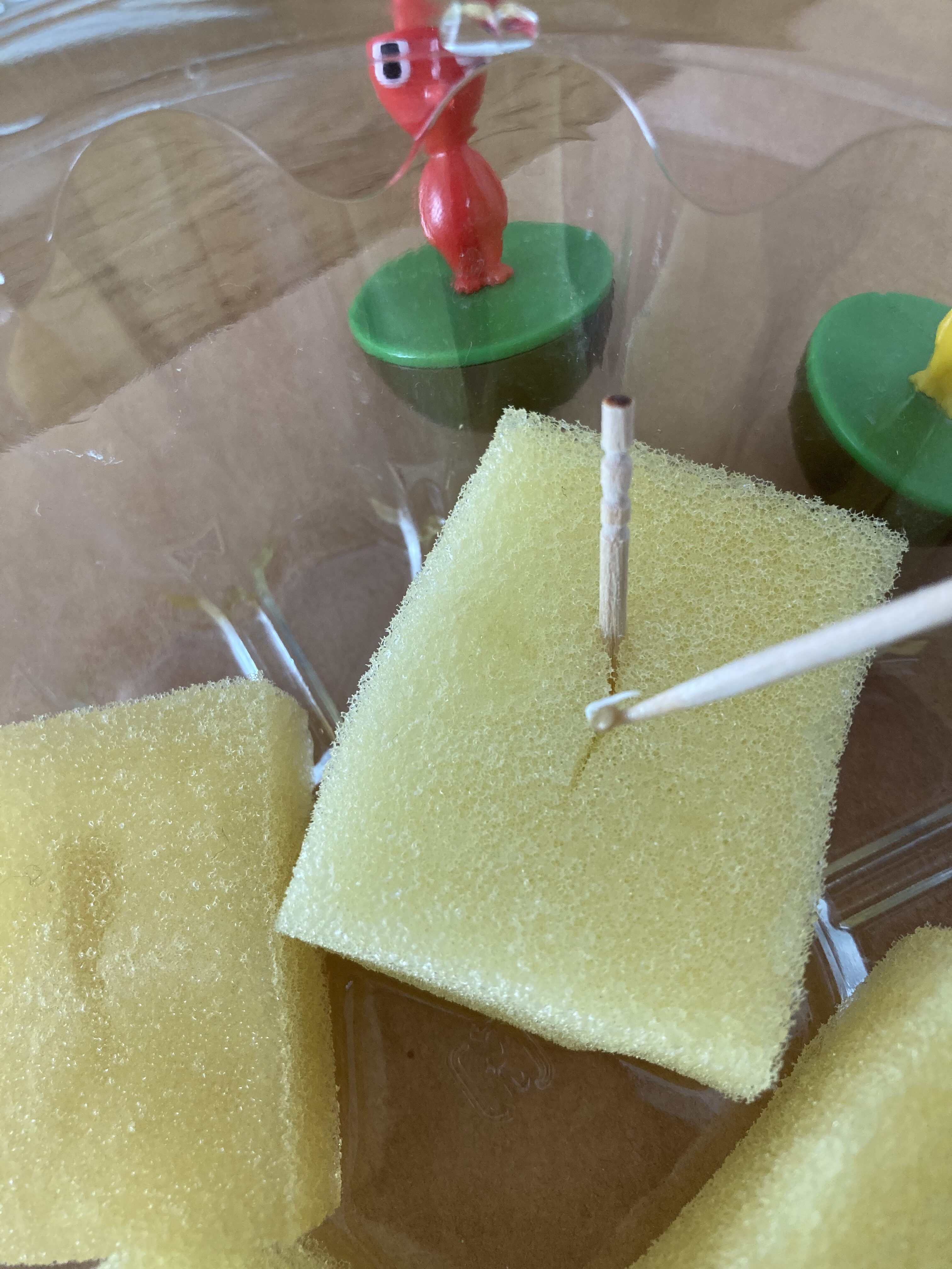- 濡らしたスポンジに種を1粒ずつ移植(爪楊枝を使ってます)