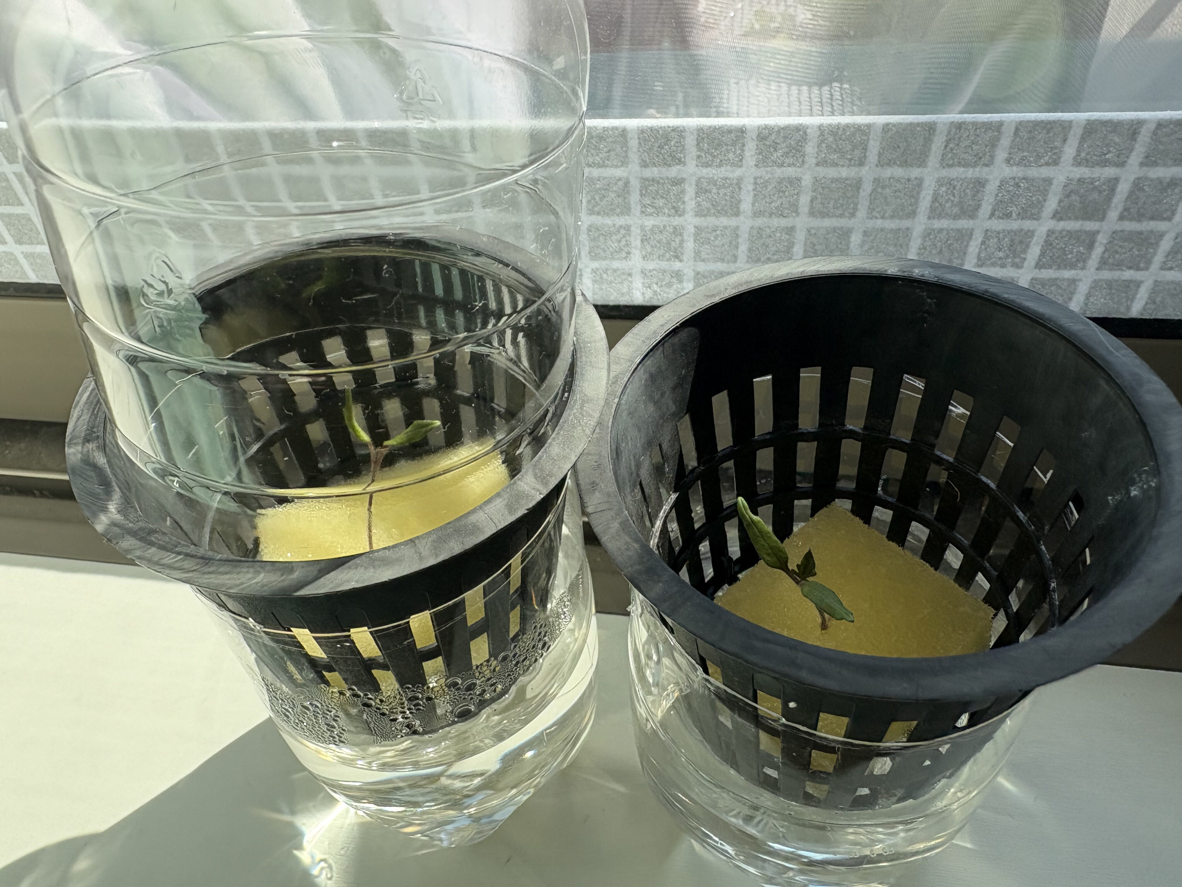 双葉が展開し、スポンジの下から根が伸びてきました。